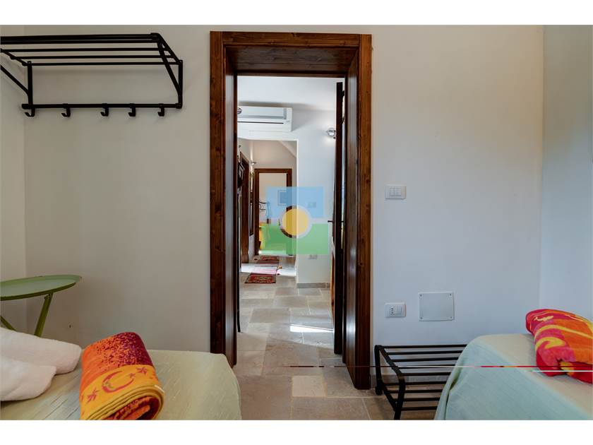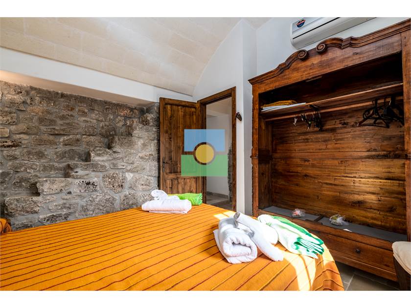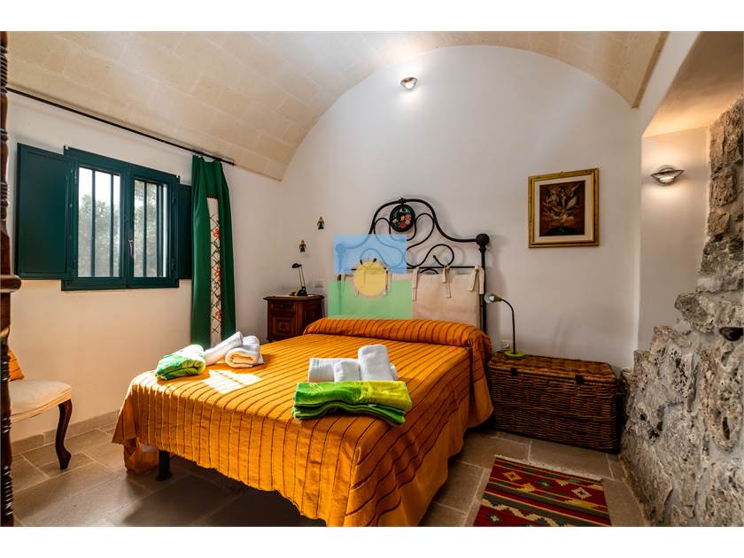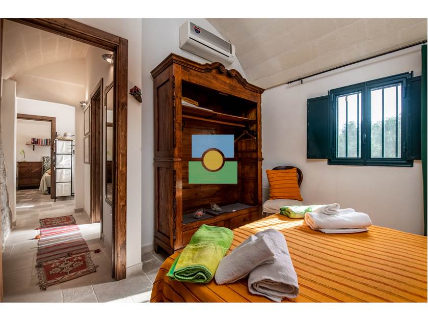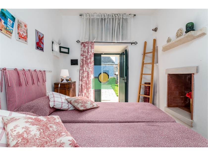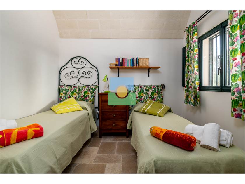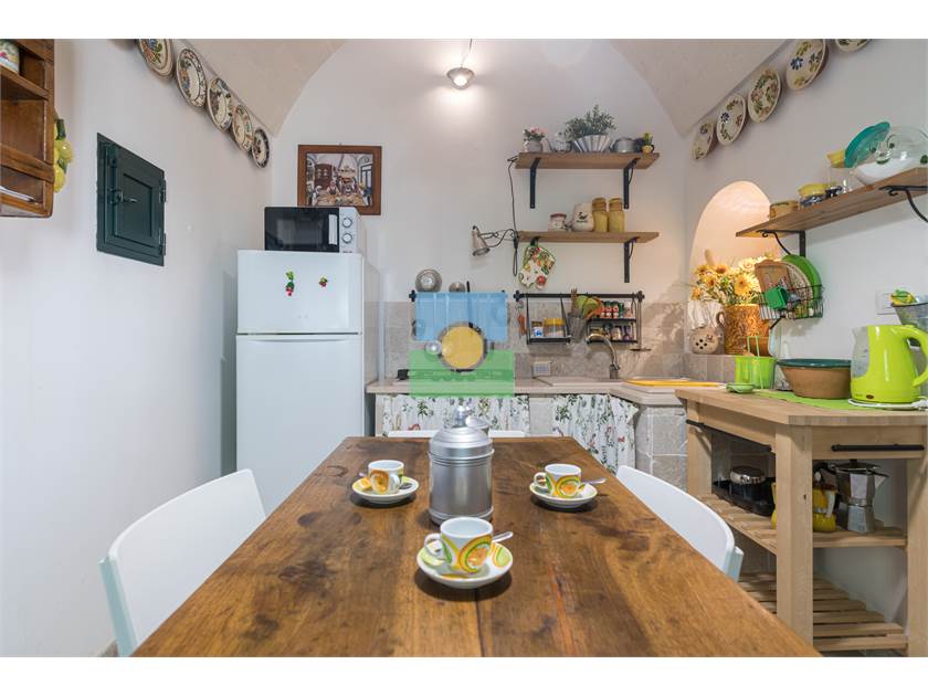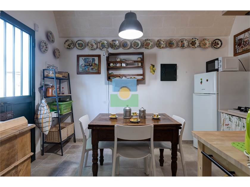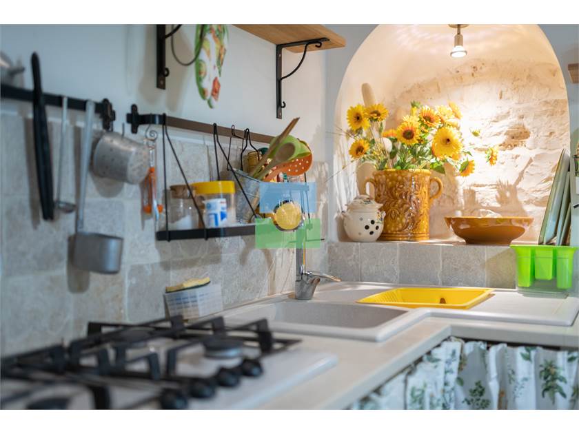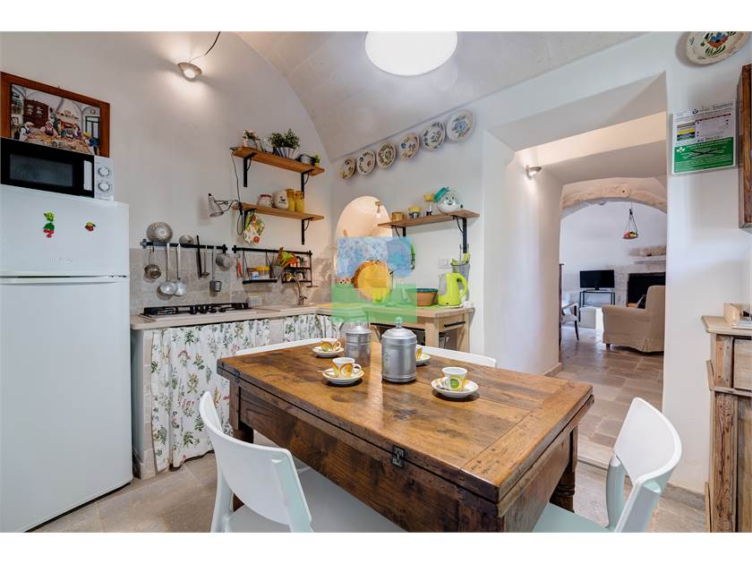 Dans le trullo, nous avons une cuisine et un petit salon, 2 chambres, une chambre double et l'autre avec 2 lits simples. De la cuisine on accède à une véranda d'où vous pourrez admirer le jardin et la piscine.
